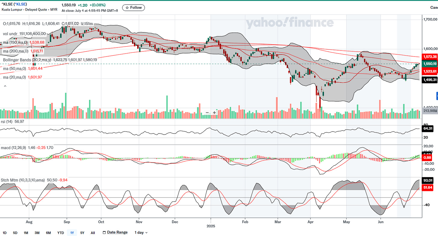 富时大马综合指数(FBMKLCI, ^KLSE)的技术走势有所改善,但仍存在一定风险。目前股指刚刚突破20日与50日移动平均线,显示短期趋势有望反转。同时,MACD指标出现向上交叉,显示动能初步回升。随机动量指标处于较高水平(93),暗示可能出现超买,而RSI为57,仍属中性区域。成交量保持稳定,但若要确认趋势反转,股指需突破长期下行趋势线及150日均线(约1573点)上方压力。在此之前,指数整体仍处于下行通道内。